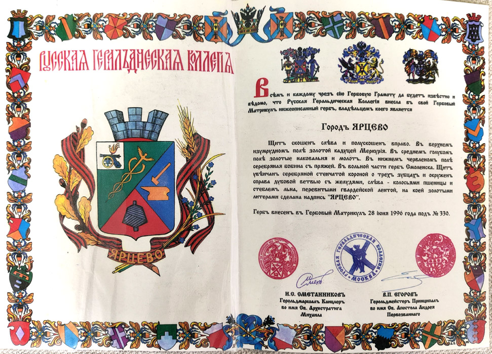 Герб Ярцево утвержден Постановлением Главы Администрации от 08.07.1996 № 569 "Об утверждении герба и флага г. Ярцево". Согласно описанию герба: "Щит скошен слева и полускошен вправо. В верхнем зеленом поле золотой кадуцей Меркурия. В среднем голубом поле золотые наковальня и молот. В нижнем красном поле серебряная бобина с пряжей. В вольной части герб Смоленска. Щит увенчан серебряной башенной короной о трех зубцах и окружен справа дубовой ветвью с желудями, слева - колосьями пшеницы и стеблем льна, перевитыми гвардейской лентой, на которой золотыми литерами сделана надпись - "ЯРЦЕВО" Кадуцей символизирует торговлю (а точнее деятельность купца А.И.Хлудова), молот с наковальней и бобина - основные отрасли промышленности. Гвардейская лента напоминает, что на территории района одна из дивизий стала гвардейской. Использованы материалы статьи Г.Ражнева в журнале "Гербовед", № 12. Фото свидетельства о внесении герба в гербовый матрикул РГК (1996) Герб подтверждён Решением Ярцевского районного Совета депутатов от 24.09.2002 № 143 "Об утверждении Положения "О гербе и флаге муниципального образования "Ярцевский район". ... Положение об официальных символах города Ярцево утверждено Решением Совета депутатов Ярцевского ГП от 24 августа 2006 года № 40. 1. Описание герба города Ярцево: