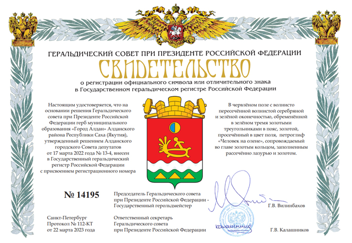 17 марта 2022 года Решением Алданского горсовета депутатов № 13 утвержден герб Алдана (cо знаками статуса города трудовой доблести).