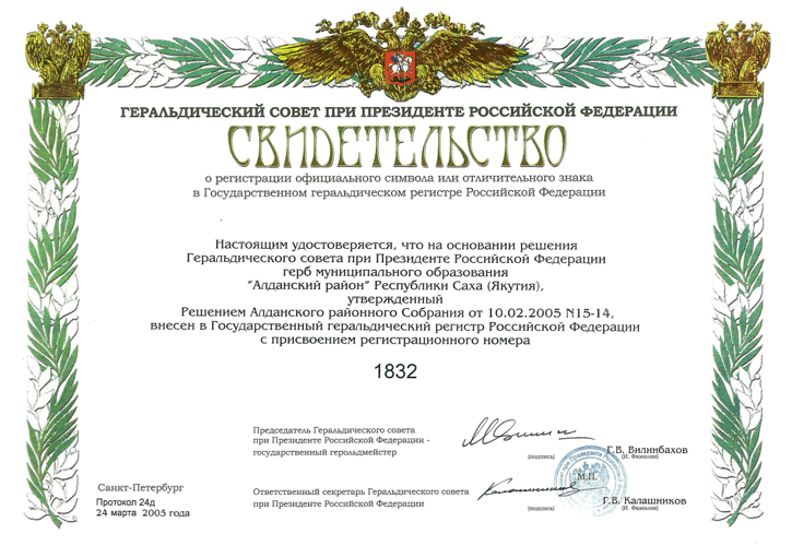 февраля 2005 года № 15-14 "Об утверждении герба МО "Алданский район" и внесен в Государственный геральдический регистр Российской Федерации под № 1832.
