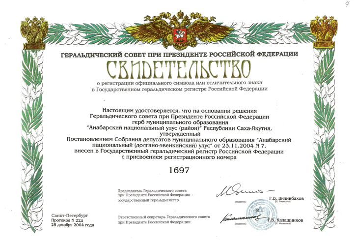 Герб наслега внесен в Государственный геральдический регистр Российской Федерации под № 1697, а также зарегистрирован и Геральдическим советом при Президенте РС(Я) [Свидетельство № 3/002]. |