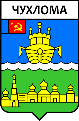 В 1981 году был выпущен сувенирный значок с геральдической эмблемой Чухломы (неофициальное описание составлено по значку Ю.Калинкиным для "Геральдикума"): "В верхней части щита в лазоревом поле на синей шиповидной оконечности золотая корма галеры с опущенными лестницами, в нижней - в лазоревом поле справа, сопровождаемая справа одним, слева двумя деревьями, слева церковь с тремя куполами и слева от нее часовня; все фигуры золотые". Изображение подготовлено для "Геральдикума" Ю.Калинкиным (г.Долгопрудный) |
