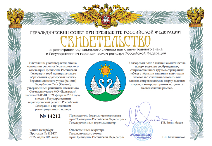 Герб внесен в Государственный геральдический регистр РФ под № 14212 .