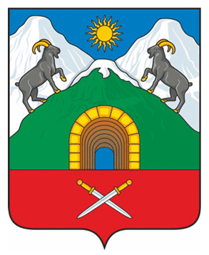 "В лазоревом поле, на включенной червленой оконечности, обремененной серебряными перекрещенными кинжалами с золотыми рукоятями, – зеленая с заснеженной серебром вершиной гора, обремененная золотым сквозным и прямо стоящим на оконечности тоннелем, с арочным входом и сводами, при этом позади зеленой горы и выше нее выходят еще две серебряные подобные горы, каждая обремененная сообращенно взбирающимся по склону зеленой горы черным кавказским туром, с золотым рогами и копытами; все сопровождаемо во главе, между серебряных гор, золотым пламенеющим солнцем (без лица)".