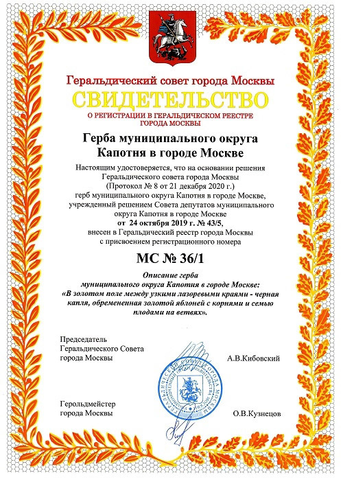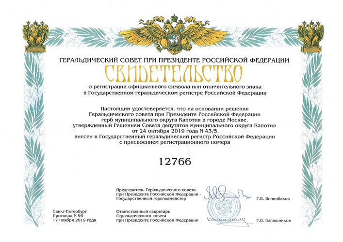 Герб внесен в Государственный геральдический регистр РФ под № 12766 и в Геральдический реестр города Москвы МС №36/1.