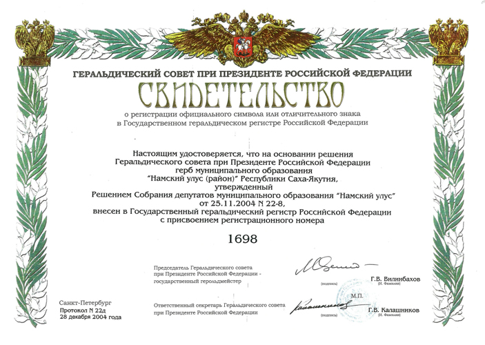 Положение о гербе Намского улуса утверждено Решением Улусного совета от 2 апреля 2004 года №16-4. В Положении содержалось такое описание герба: "3.1. Герб муниципального образования «Намский улус» представляет с собой круг, в центре которого изображение белого лебедя с поднятыми в виде круга крыльями, волнообразной полоской под лебедем. Круг обрамлен темной полоской украшенной в верхней части традиционным национальным орнаментом в виде семи ромбических кристаллообразных фигур.