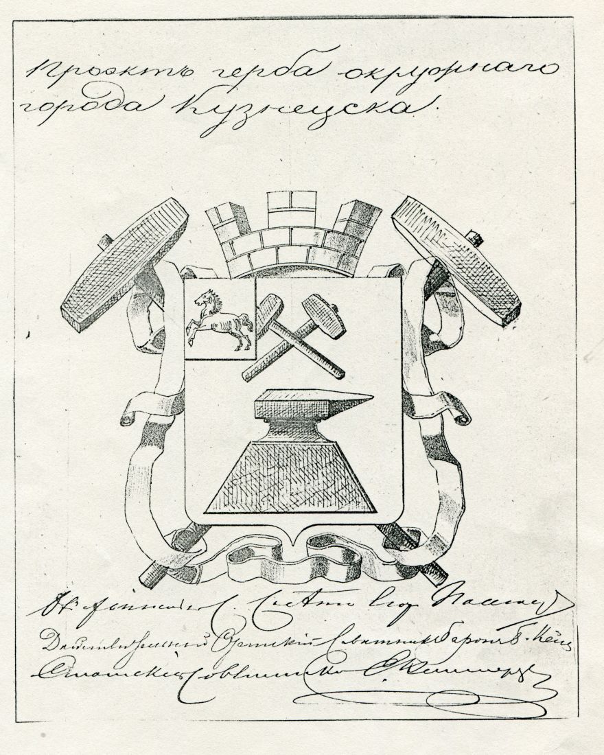 В середине XIX века (24.11.1864) был разработан (но не утвержден) проект герба Кузнецка. "В золотом щите черная наковальня, сопровождаемая в главе щита 2 такими же накрест положенными молотками". За щитом золотые молотки. Материалы геральдического архива В. Маркова. Веб-оптимизация рисунка выполнена для "Геральдикума" Ю.Калинкиным. Справа - рисунок проекта герба из Новокузнецкого краеведческого музея. В конце 1920 годов рядом с Кузнецком вырос поселок Сад-Город, переименованный в 1931 году в город Новокузнецк, уже через год он получил имя Сталинск. В 1939 году Сталинск и Кузнецк объединились, некоторое время город носил имя Сталинск-Кузнецк. С 1961 года - Новокузнецк. |