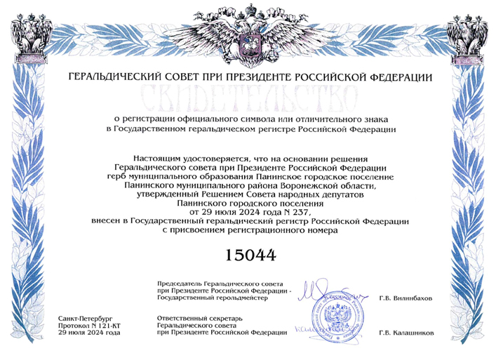 Герб внесен в Государственный геральдический регистр РФ под № 15044.
