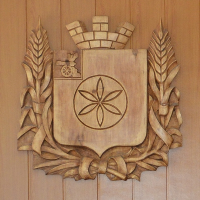 В зале заседаний совета депутатов Руднянского муниципального округа на стене изображен такой герб. Обрамление щита имитирует оформление городских гербов 2-й половины 19 века. Но лента по цветам соответствует ордену Ленина. Такой вариант использовался на некоторых документах Руднянского района в 2010-х годах (на постановлениях администрации МО Руднянский район, например). Видимо этот вариант появился в конце 1990-х годов. |