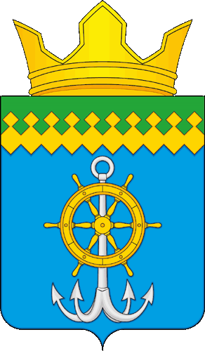 «В лазоревом поле под зеленой узкой главой, окаймленной десятью золотыми соединенными ромбами, каждый из которых вверху завершен малым ромбом – серебряный речной якорь, поверх веретена которого положен золотой судовой штурвал».