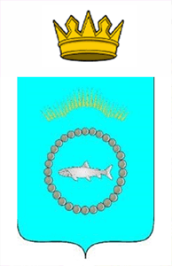 "В лазоревом поле серебряная семга, окруженная серебряными жемчужинами, сложенными в кольцо, сопровождаемое во главе золотыми лучами, расходящимися вверх от тройной дуги".