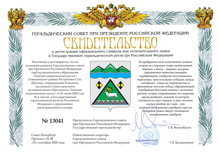 Герб и флаг Тянского национального наслега утверждены решением наслежного Совета депутатов от 01.06.2020 года № 2. Описание герба: "В серебряном поле отвлеченное зелёное острие по сторонам тонко окаймленной чёрным, а внизу - широко лазурью, украшенной многочисленными серебряными, сообразно полученными червленью, треугольными зубцами, между которыми - такие же опрокинутые и просеянные золотом зубцы; обременённый серебряным бегущим оленем с золотыми рогами; острие сопровождено по сторонам двумя ромбами, каждый из которых составлен из двух черных и двух золотых малых ромбов; во главе - три зелёные, заснеженные серебром горы на лазоревом поясе, вверху нитевидно окаймленном серебром". Герб внесен в Государственный геральдический регистр РФ под № 13041. Материалы геральдического архива В. Маркова. Фото свидетельства - официальный информационный портал Республики Саха |