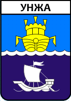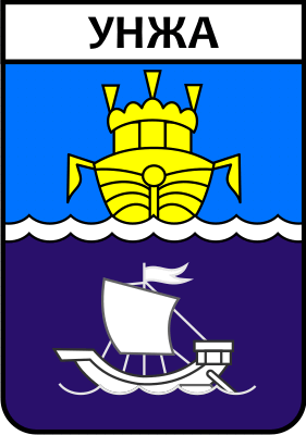 До 1778 года Унжа была центром уезда. Затем уездное правление перешло в Макарьев. В XIX веке Унжа была заштатным городом Макарьевского уезда Костромской губернии. До 2024 года село Унжа было центром Унженского сельского поселения Макарьевского района. В 1867 году составлен проект герба Унжи (по новым правилам 1857 года): "В серебряном щите лазоревая волнообразная перевязь влево, сопровождаемая 2 черными шарами. В вольной части герб Костромской губернии. Щит увенчан червлёной башенной короной о трёх зубцах и окружён золотыми колосьями, соединенными Александровской лентой". Материалы геральдического архива В.Маркова (г.Санкт-Петербург); изображение подготовлено для "Геральдикума" Ю.Калинкиным (г.Долгопрудный) |