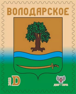 Герб Володарского района. утвержден решением №IV/2-43 Володарского районного совета от 26 июня 2002 года. Авторы герба - Е.И.Малаха, П.В.Чесноков. "В лазурном поле зеленая волнистая оконечность, увенчанная тройным волнистым серебряным поясом. Поверх всего изображена полуфигура каменного человека натурального цвета, сопровождаемая вверху положенными накрест серебряными русским мечом и казацкой саблей.Щит обрамлен тремя стеблями злака с колосьями (справа) натурального цвета и зеленой дубовой ветвью с золотыми желудями (слева), обвитыми лазурной лентой, в нижней части которой золотыми литерами на украинском языке начертано название территории - «Володарський район».